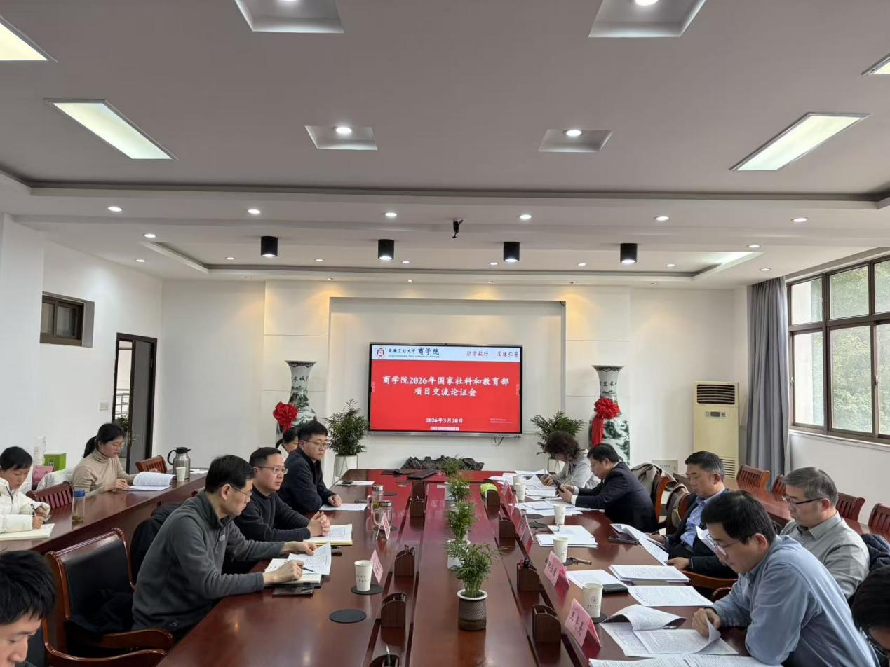 3月20日下午,商学院组织召开了2026年度国家社科基金以及教育部人文社科基金项目申报论证会。会议特邀了南京大学郑江淮教授、王亮亮教授,南京航空航天大学周德群教授,安徽大学李静教授、管治华教授和胡晓涛副教授等六位专家莅临指导。院长章铁生、副院长周世军和项目申请教师等参加了论证会,会议由周世军主持。